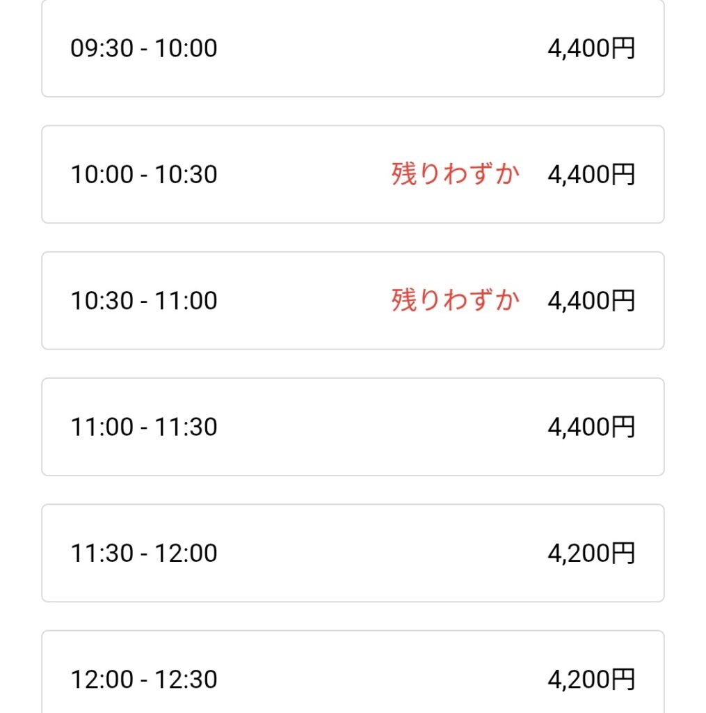 変な時間や、1人枠しかなかった。なので、早めに予約をするのが確実だと思いました。
