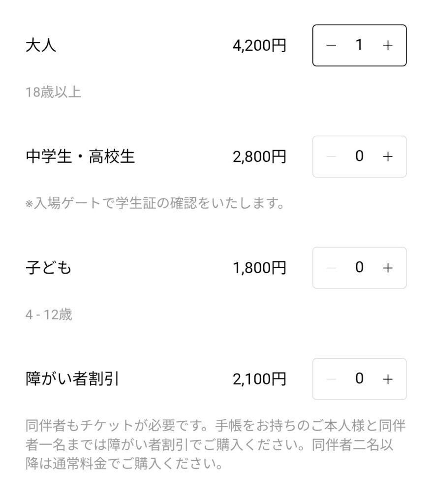 同伴者もチケットが必要です。手帳をお持ちのご本人様と同伴者一名までは障がい者割引でご購入ください。同伴者二名以降は通常料金でご購入ください