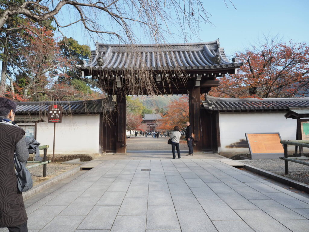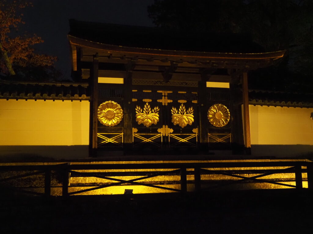国宝であり、慶長4年(1599年)に建立された勅使門です。黒漆塗りで、四つの大きな紋に金が施されています。