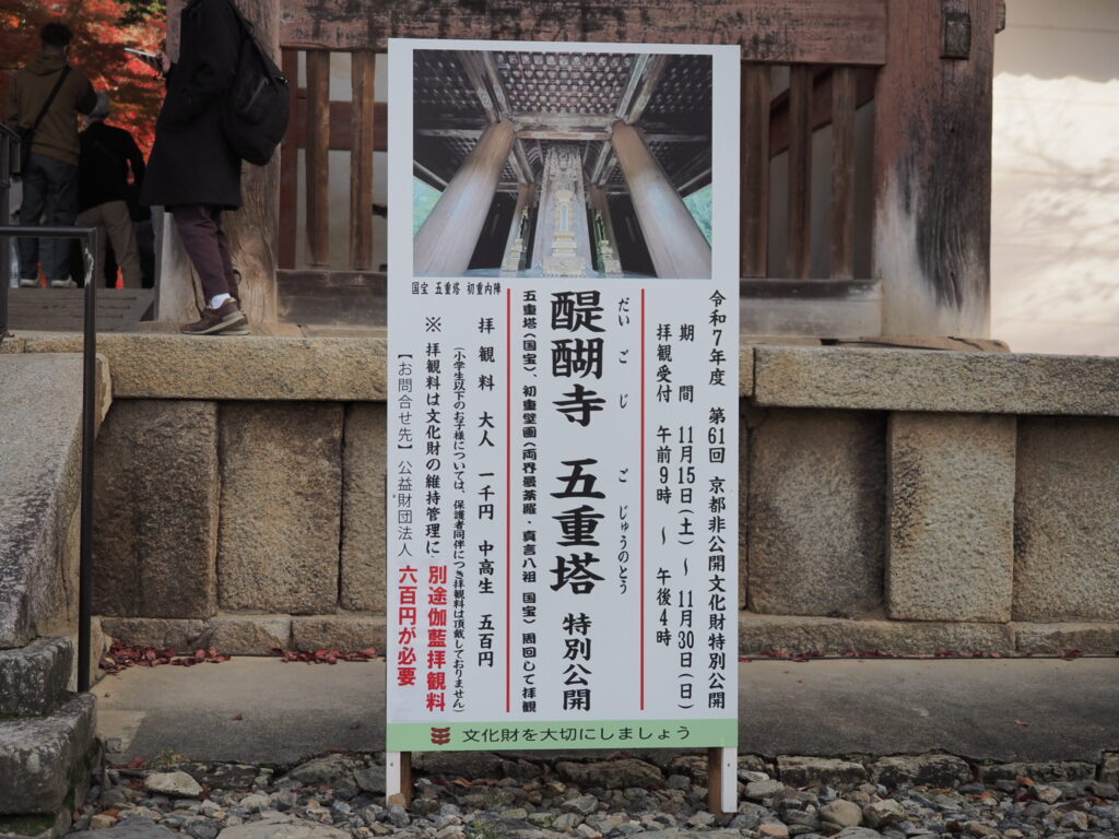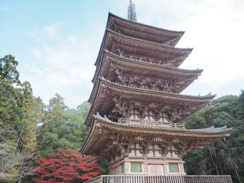 村上天皇の天暦5 (951)年に完成した。初層の内部には両界曼荼羅や真醍醐天皇の菩提を弔うため、第十一皇子・朱雀天皇が承平6(936)年に毎月29日には、ご開扉法要が営まれる。京都府下最古の木造建築物で、高さは約38メートルです
