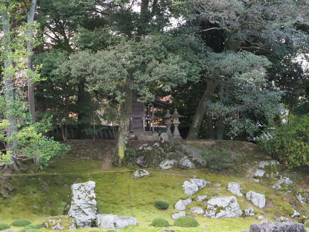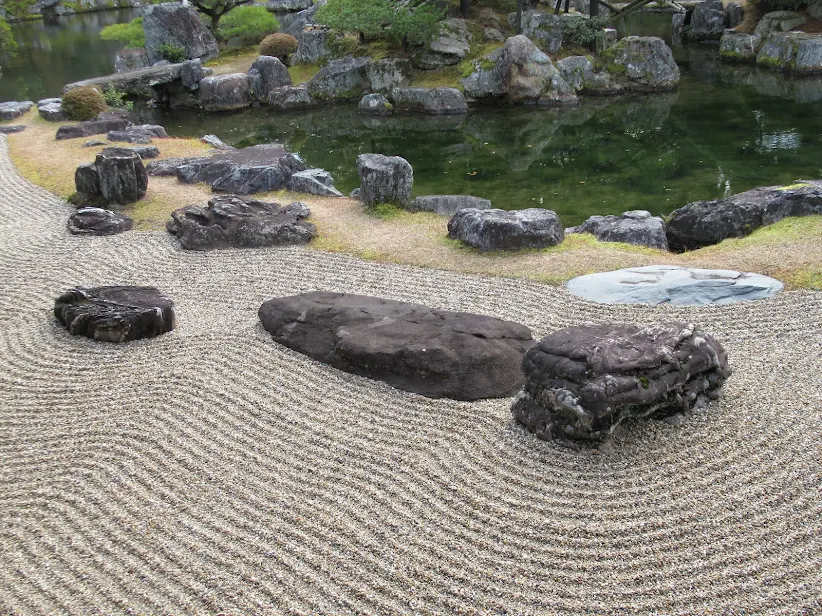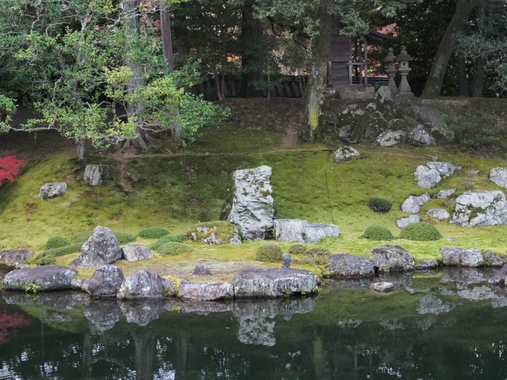 池の手前の枯山水に三つ並んだ石が置かれています。