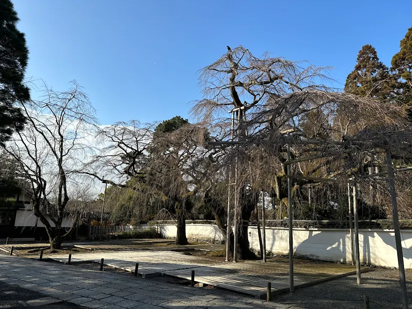 三宝院の大玄関前にある「太閤しだれ桜」の南側に植えられているのは、組織培養によって誕生したクローン桜で、「太閤千代しだれ」と命名されています。